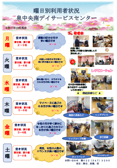 > 泉中央南デイサービスセンターの空き情報 令和7年10月現在