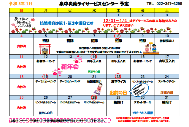 > ☆令和8年1月 レクリエーションカレンダー☆