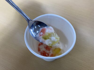 嚥下などの兼ね合いから、固形のお菓子を食べる事が難しい利用者さんには職員お手製のゼリーを召し上がって頂きました。